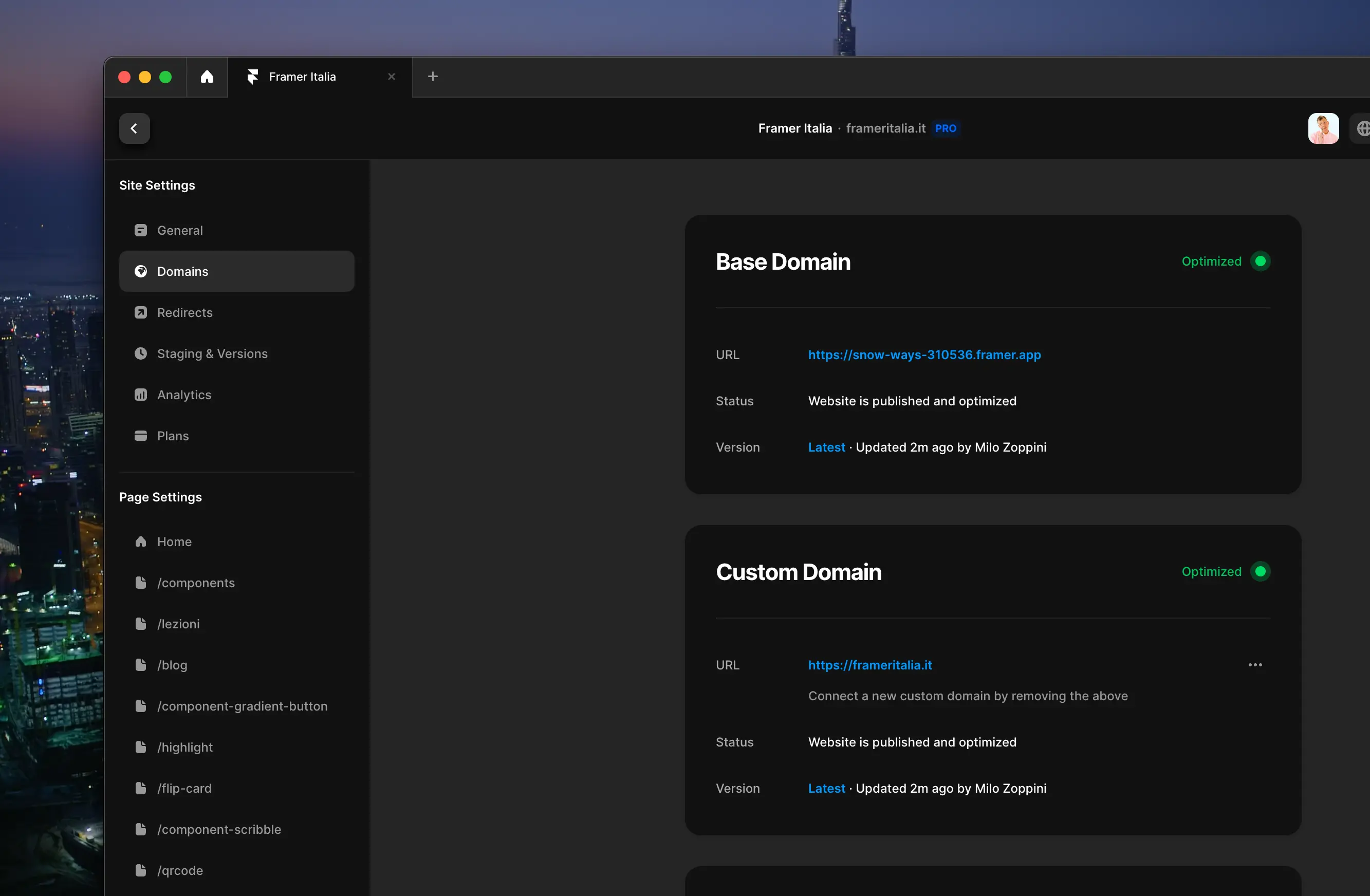 Congratulazioni! Hai importato un sito web su Framer da un remix link, lo hai personalizzato e pubblicato con un dominio personalizzato. Ora il tuo sito web è accessibile al pubblico.