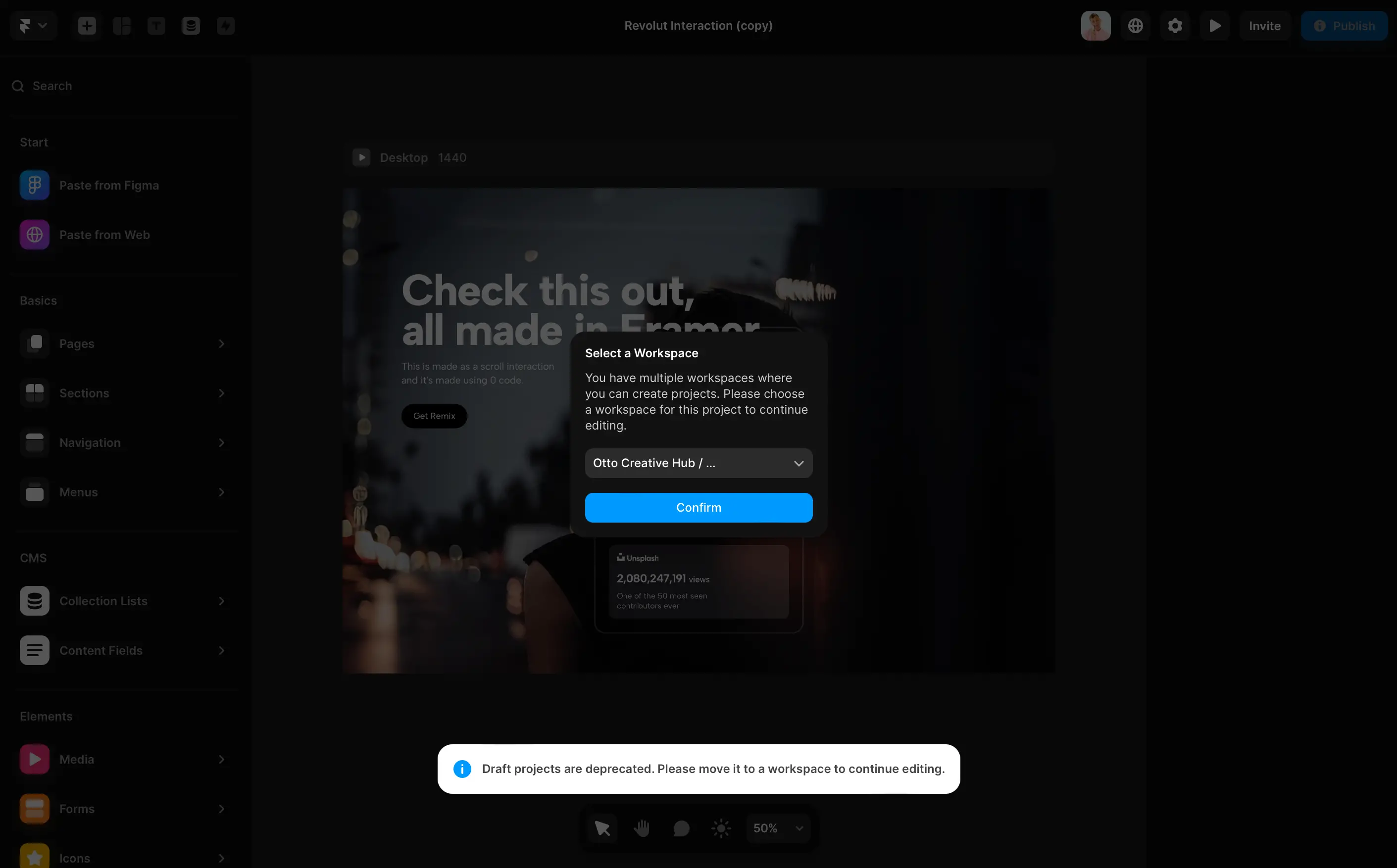 Framer importerà automaticamente il sito web e lo renderà disponibile per la modifica e la personalizzazione nella sua interfaccia.