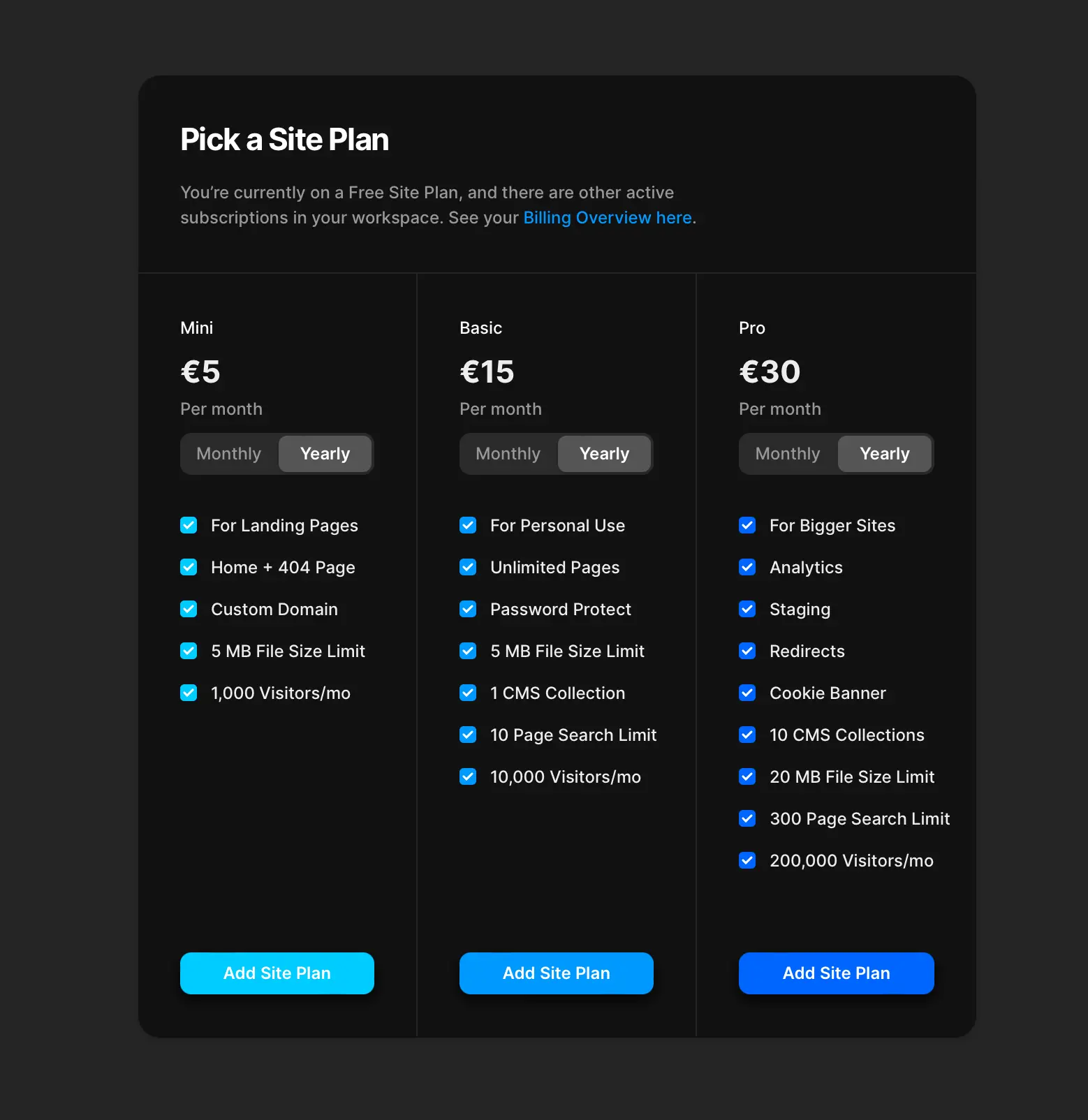 Framer offre diverse opzioni di pianificazione per il tuo progetto, ciascuna con funzionalità diverse. Scegli il piano che meglio si adatta alle tue esigenze e ai tuoi budget. Assicurati di avere un piano che consenta la pubblicazione.